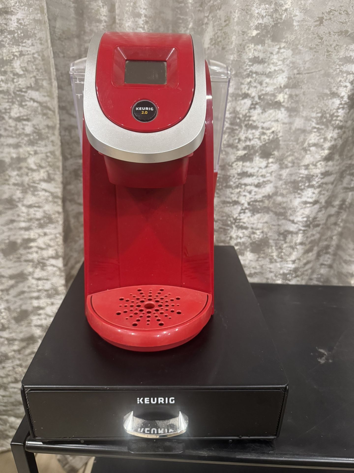 Keurig 2.0 coffee maker with pod holder drawer included. Works well and makes great coffee. The drawer holds K-cups neatly underneath the machine to save counter space.