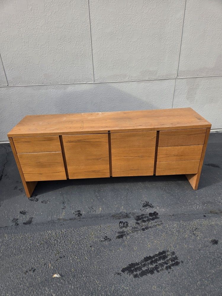 Solid wood credenza. Cabinet opening in the middle, drawers on both ends.