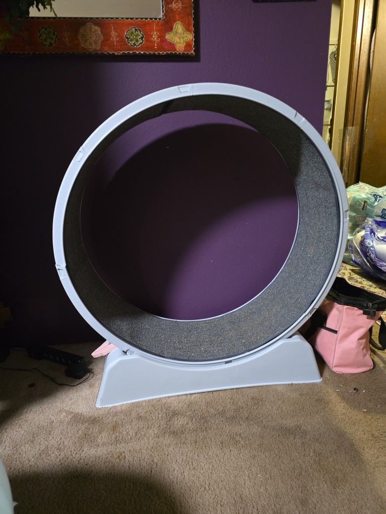 Cat wheel, never used, the wheel is roughly 30"x30" add another 3" for the base. I had to get a bigger one for my cats, as they are way too big for this one! So if you have a little indoor kitty, it would make a great Christmas present πΈπ