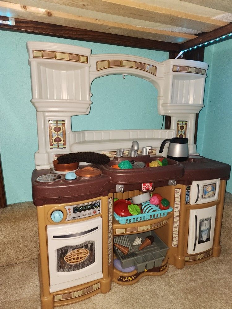 Step 2 play kitchen and play food, pans, plates, and cups. Has sounds and lights.