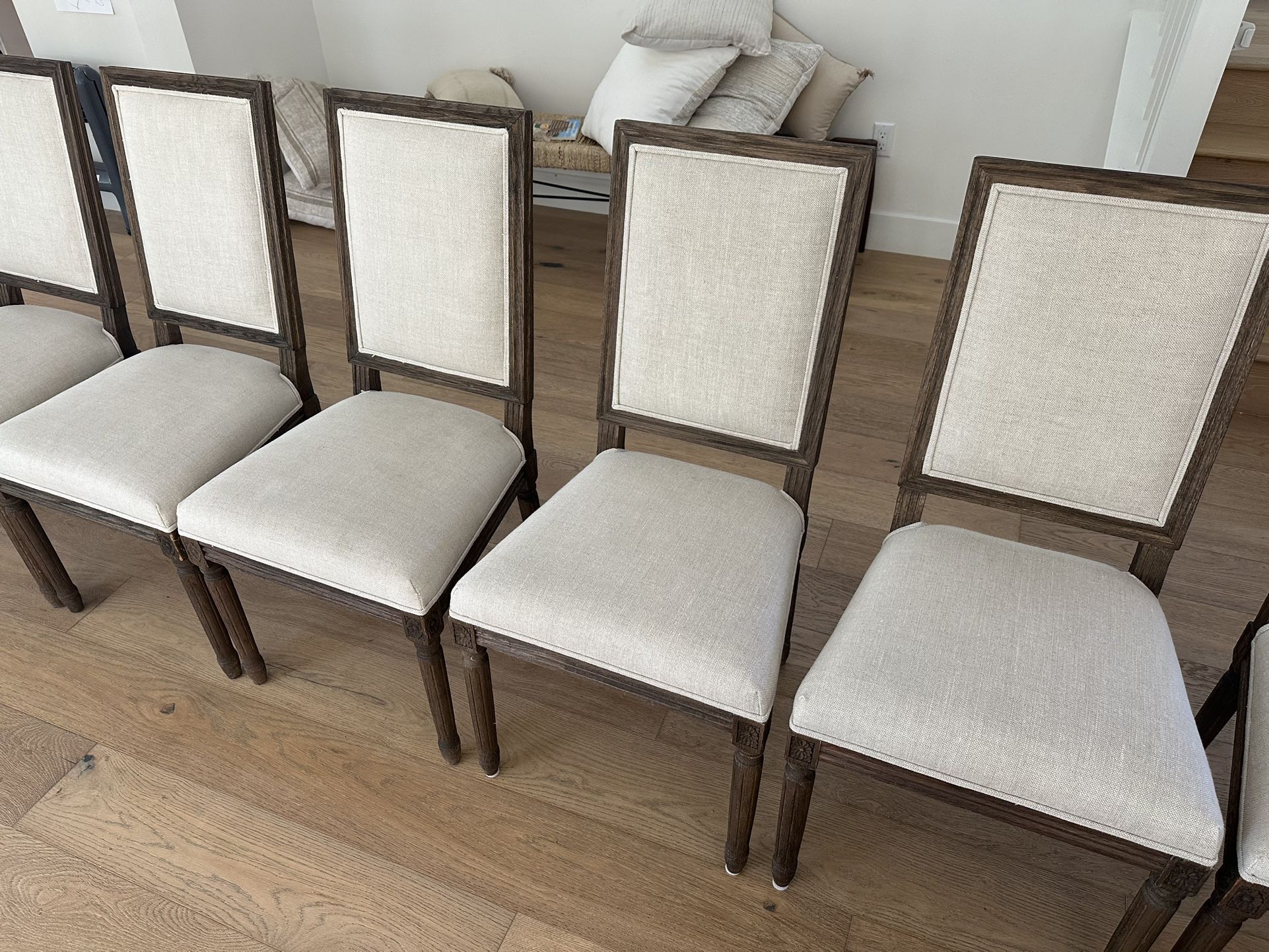 Price is per chair. Restoration Hardware (RH) Vintage French Square Back, Armless Fabric dining chairs in near new condition. These chairs were in a formal dining area and were maybe sat on less than 10 times. They are in excellent condition. No stains, no rips, no tears, non smoking, no pets… Originally purchased for $650 per chair. 4 armless chairs available… Seat Height is 19”…Color is Sand Belgian Linen **$165 seach chair**