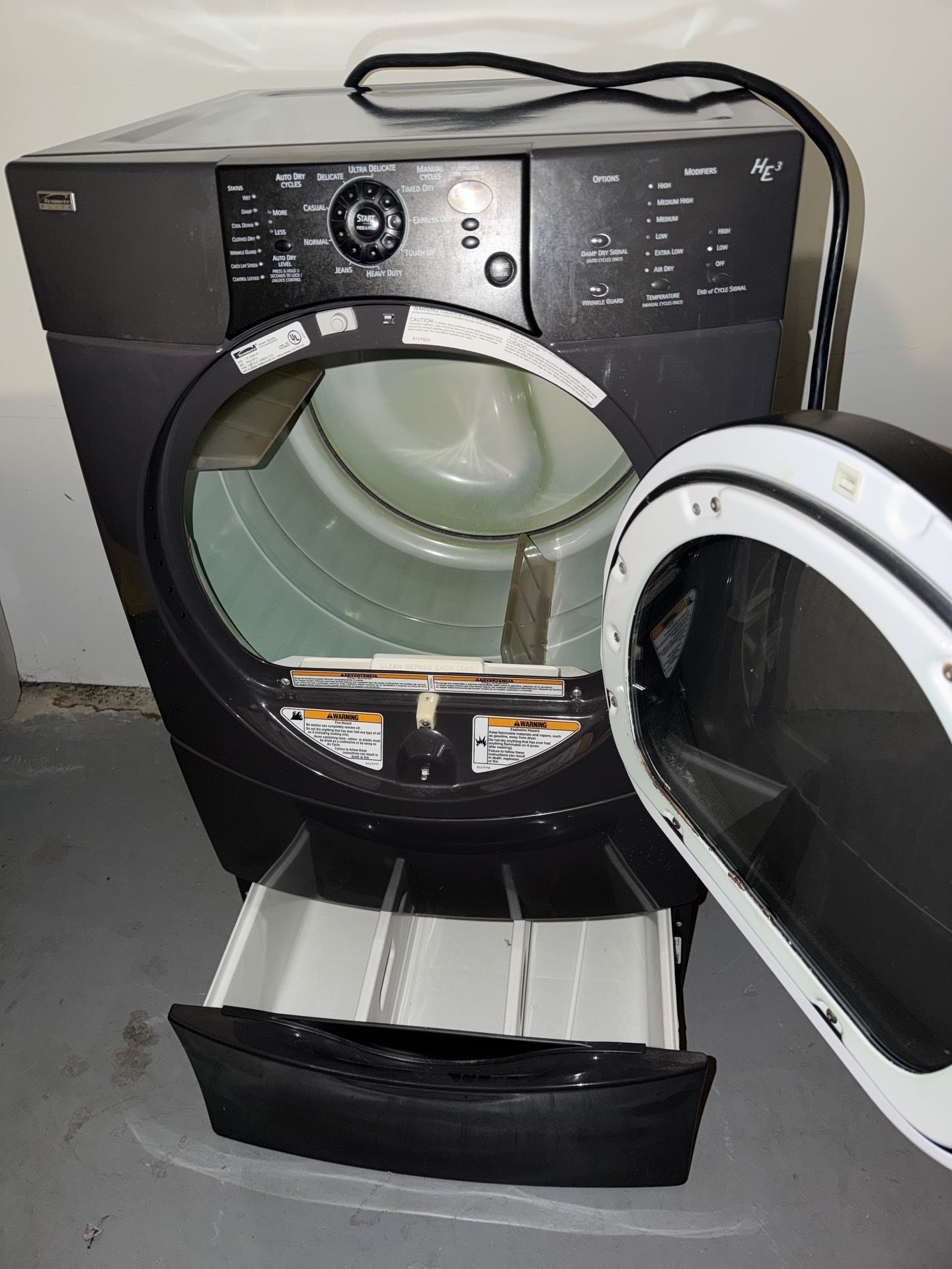 Dark Gray Kenmore Dryer with pedestal for extra space