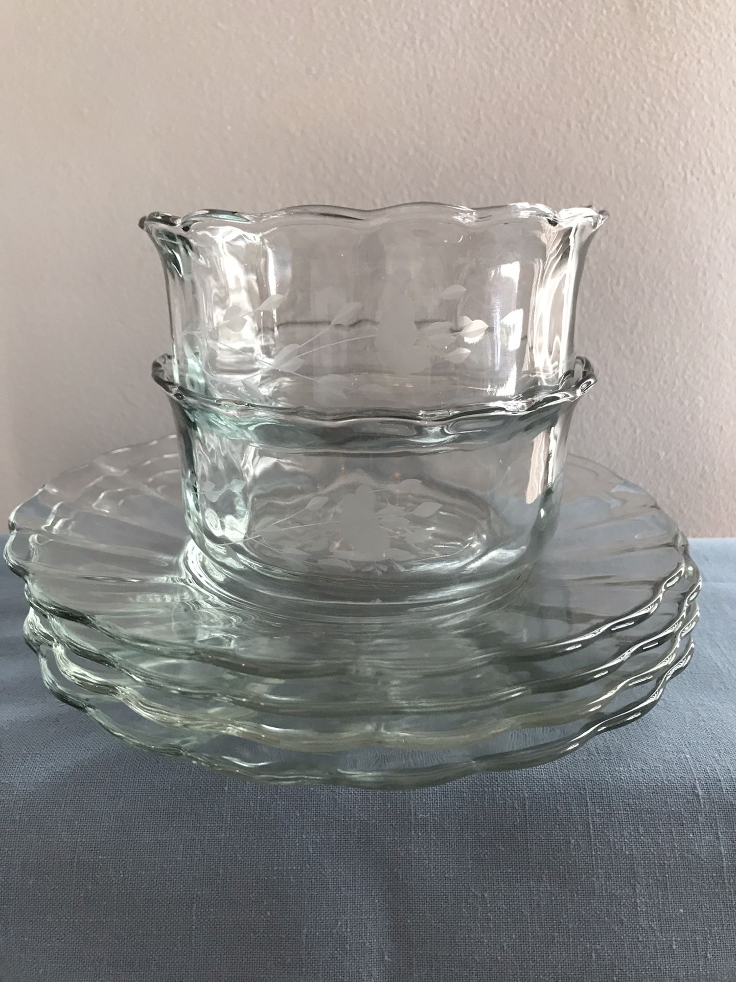 Two bowls and four plates. No chips or cracks. No box. Will trade for Princess House Aston pieces.