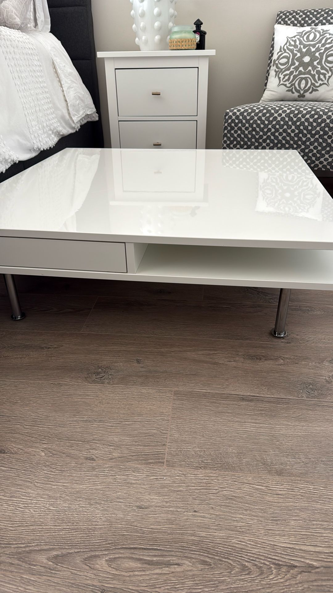 White gloss ikea coffee table, 37,5x37,5 x h 12 in, 2 drawers, 2 shelves. Some scratches on the top, but it’s hard to see in the picture. Comes from clean, pet/smoke free house.