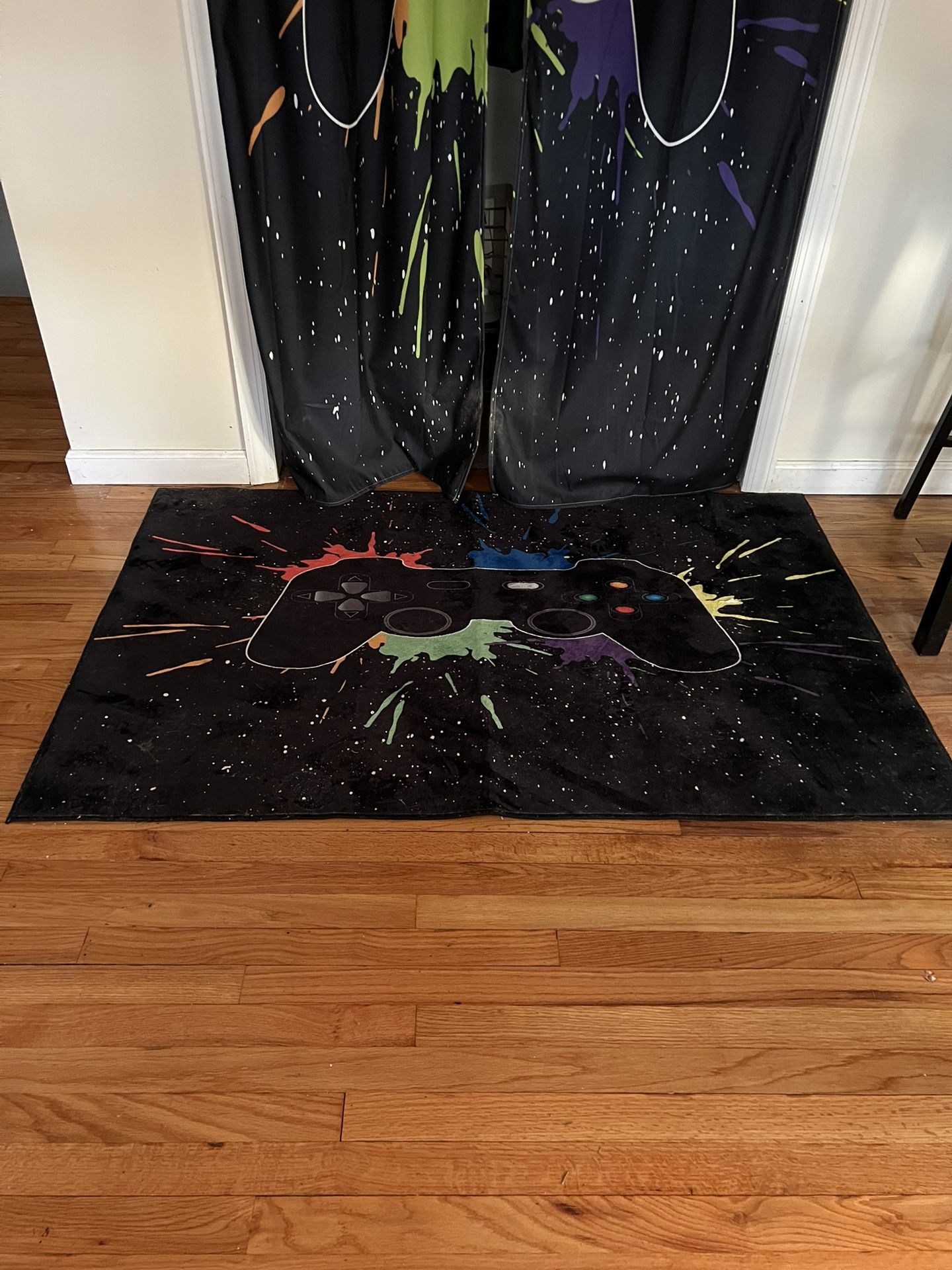 Valence a pair each 34 inches wide and 19 inches long.Curtain a pair2 feet wide and 80 inches long and rug 5 feet long and 2 feet wide
