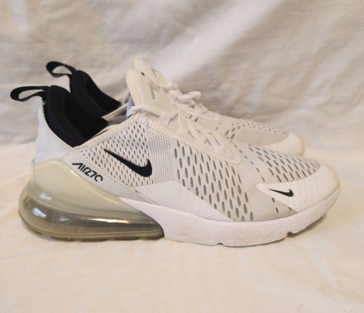 The Nike Air Max 270 Men's Running Sneakers in White / Black, size 8.5, are designed for running and jogging activities. These athletic shoes feature a low top shaft style with a lace-up closure for a comfortable fit. $50