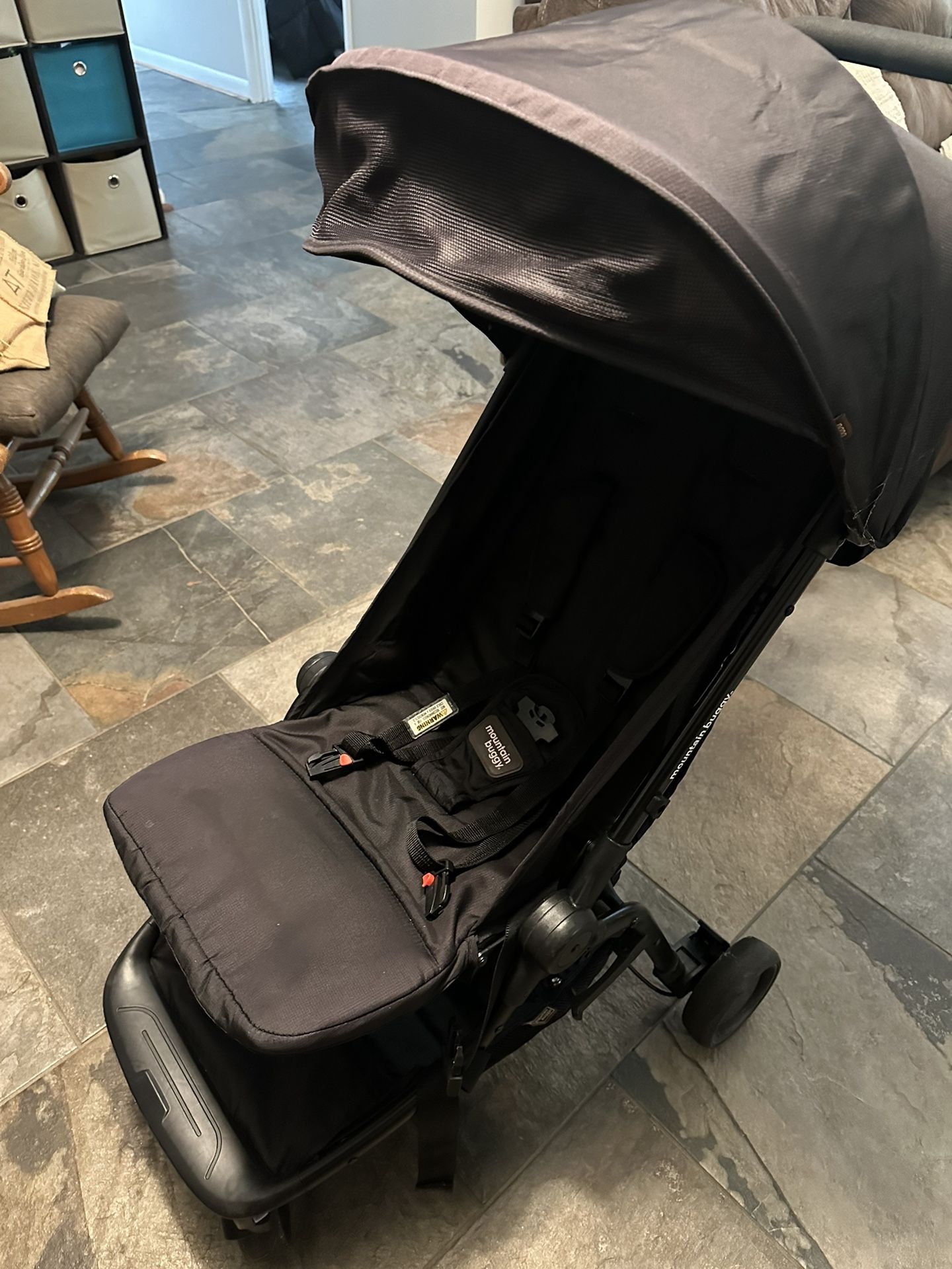 Loved this stroller but do not need anymore. $250 on Amazon right now. Folds down so small it can be used as carry on for a flight (have done this a few times. Great condition except for a small rip on the handlebar. See photo.