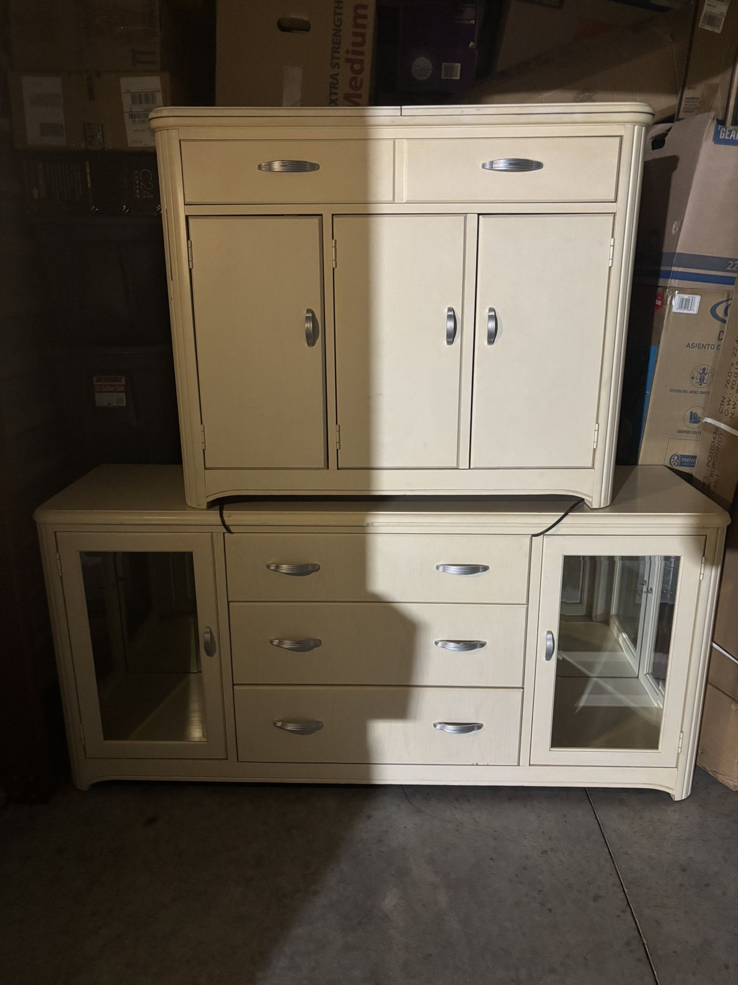 Cream colored, both are in good condition, heavy and sturdy. Smaller cabinet 3ft/3 width and 2ft/8 length, the larger cabinet is 5ft/3 width and 2ft/4 length