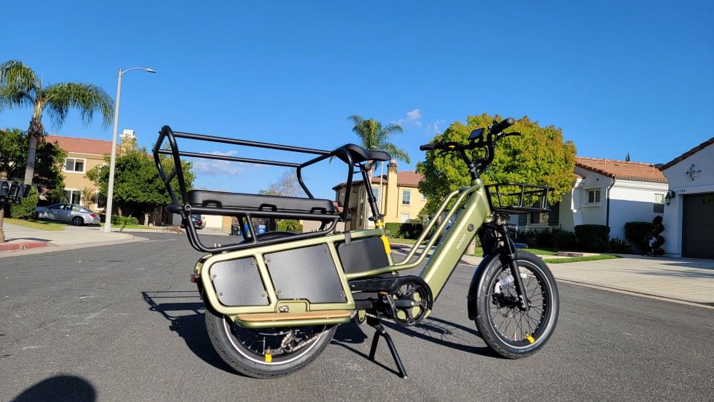 Electric Bike Cargo with everything you need to carry kids or do delivery. 2 basket included front and rear, with frame bag and more. 750 W powerful motor with large LCD, Torque sensor, Seat post suspension, Hydraulic brakes, Over $2500 value with all accessories tires: 20"x3.0" Fat Tires Top Speed 25 MPH Battery : Samsung cells Max Range 60 Miles Max load 440 lbs REAR DERAILLEUR 7 Speed FORK 60 mm travel, with lockout BRAKES: Hydraulic Disc Brakes