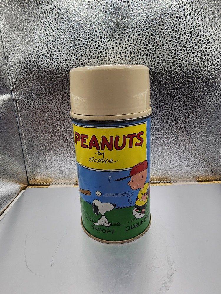 Vintage 1959 Peanuts Thermos Snoopy & Charlie Brown Metal Schultz Cartoon READ 1959 CHARLIE BROWN & SNOOPY HALF PINT PEANUTS VACUUM THERMOS. vintage 1959 Peanuts metal thermos featuring Charlie Brown and Snoopy. It is a collectible item, frequently matched with vintage Peanuts lunch boxes. The thermos often features a glass vacuum liner inside, with a plastic cap and cup on top. Its size is approximately 6.5 inches tall. Thermos has minor blemishes. Inside is clean. No cracks or dent, SEE PICTURES. By purchasing, the buyer is agreeing to ALL terms, shipping charges, and the conditions presented in the pictures.