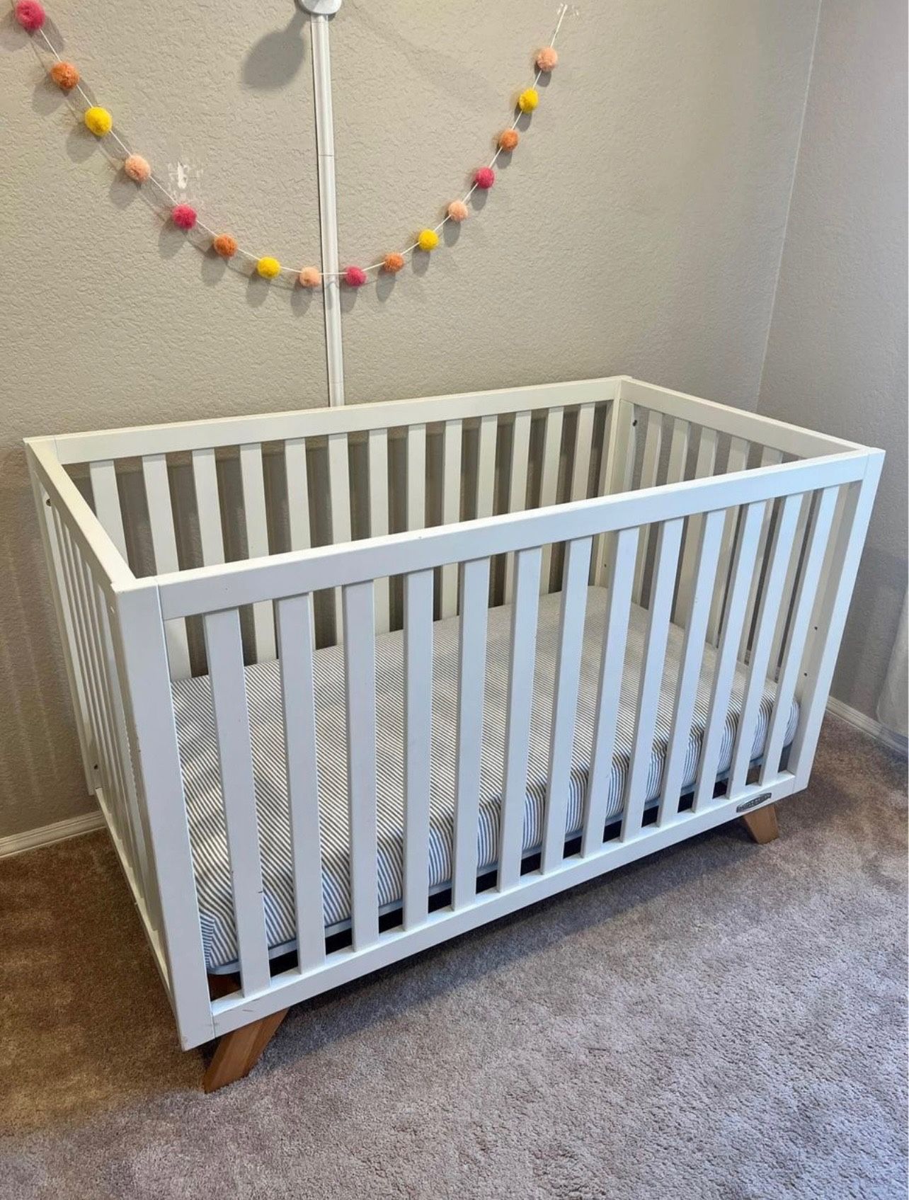 White modern convertible crib. Can purchase the toddler bed attachment on the website. Gently used, in great condition! (Mattress not included)