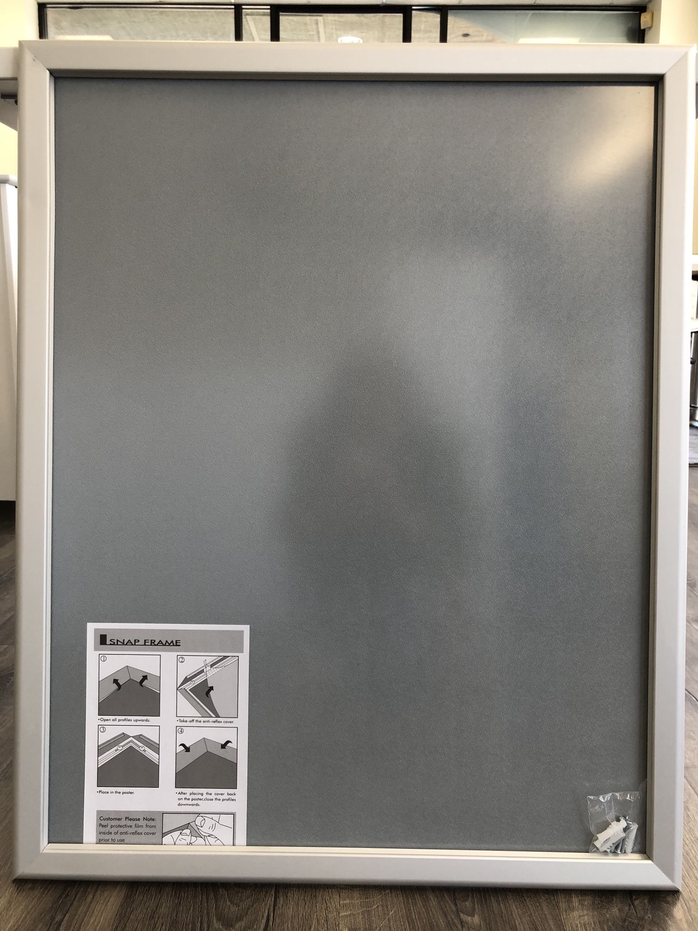 This is a wall mounted poster frame. Made of silver anodized aluminum in a matte finish. Posters rest against a styrene 22” x 28” backer inside the frame. A non-glare cover protects poster fromy damage and dirt. Includes mounting hardware. Can be mounted portrait or landscape. 2 available. One has a small indent. See photo. Cash only. Pick up only.