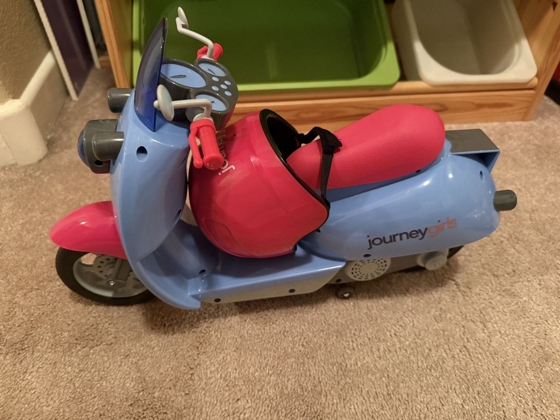 Comes with helmet. Makes noise. Also works perfect with American girl dolls