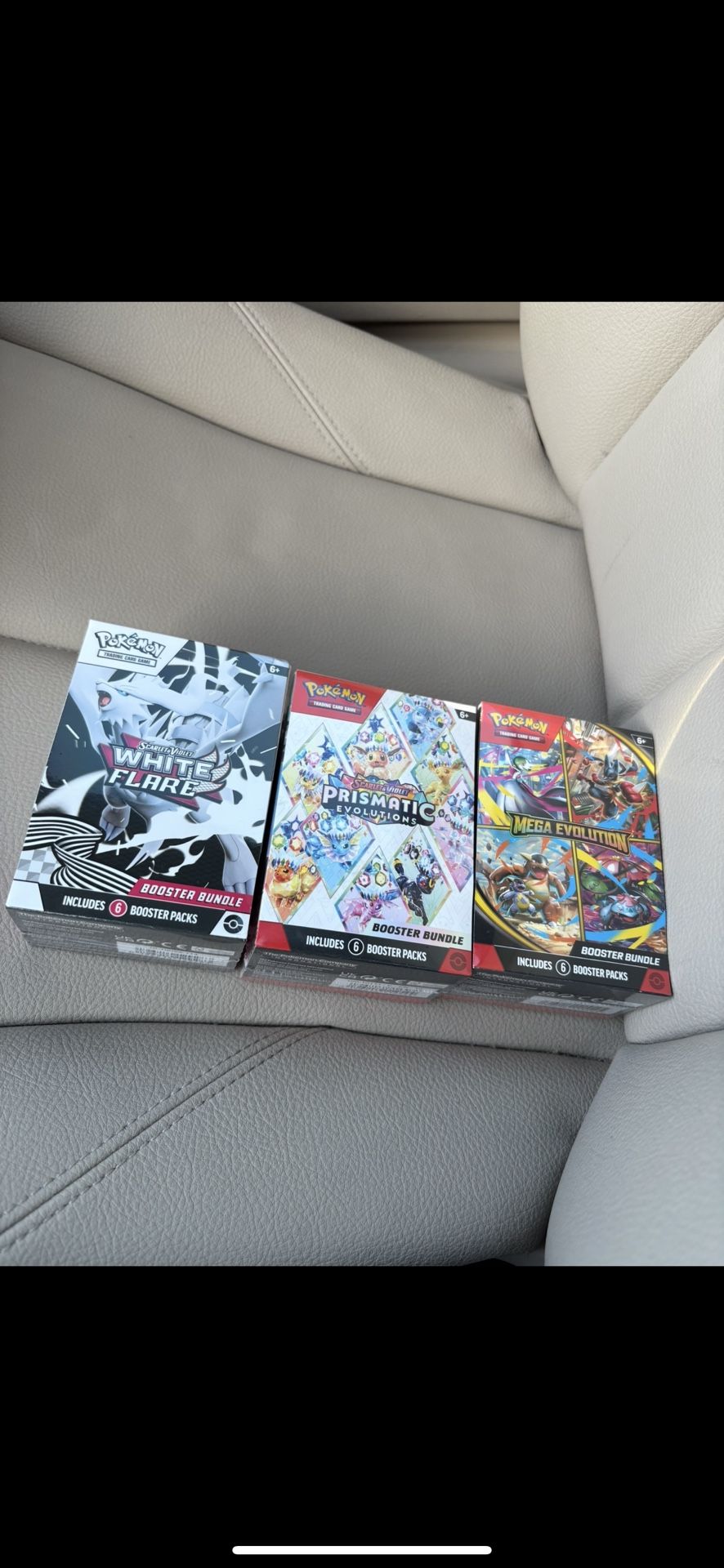 Lot Of 3 Pokemon Booster Bundle Boxes. Prismatic, White Flare, Mega Evolutions
