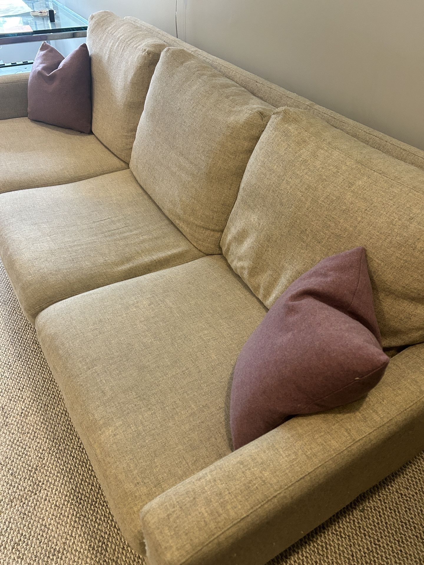 This is a classic sofa with good bones. Recently steam cleaned. Would be a wonderful reupholstery project. Exposed wood frame (walnut) in Midcentury style. Down cushions. Wool upholstery in a cream/gray with blue and darker gray highlights. Baby is about 12 years old, so has had some life/wear, but may be the most versatile and comfortable sofa I’ve owned. 35” H 86” W 36” D $400 obo $5895 new See Design Within Reach website for details. https://offerup.com/redirect/?o=aHR0cHM6Ly93d3cuZHdyLmNvbS9saXZpbmctc29mYXMvcmFsZWlnaC1zb2ZhLzcwMzUuaHRtbD9sYW5nPWVuX1VT