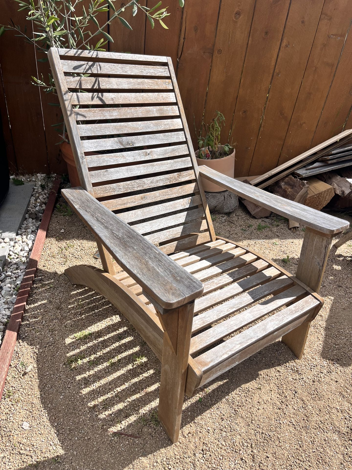 2 Adirondack chairs Originally from world market Worn with some splitting on the arm and leg but still in good shape, especially if you give a coat of teak oil. White cushions available with it if wanted 120 for both