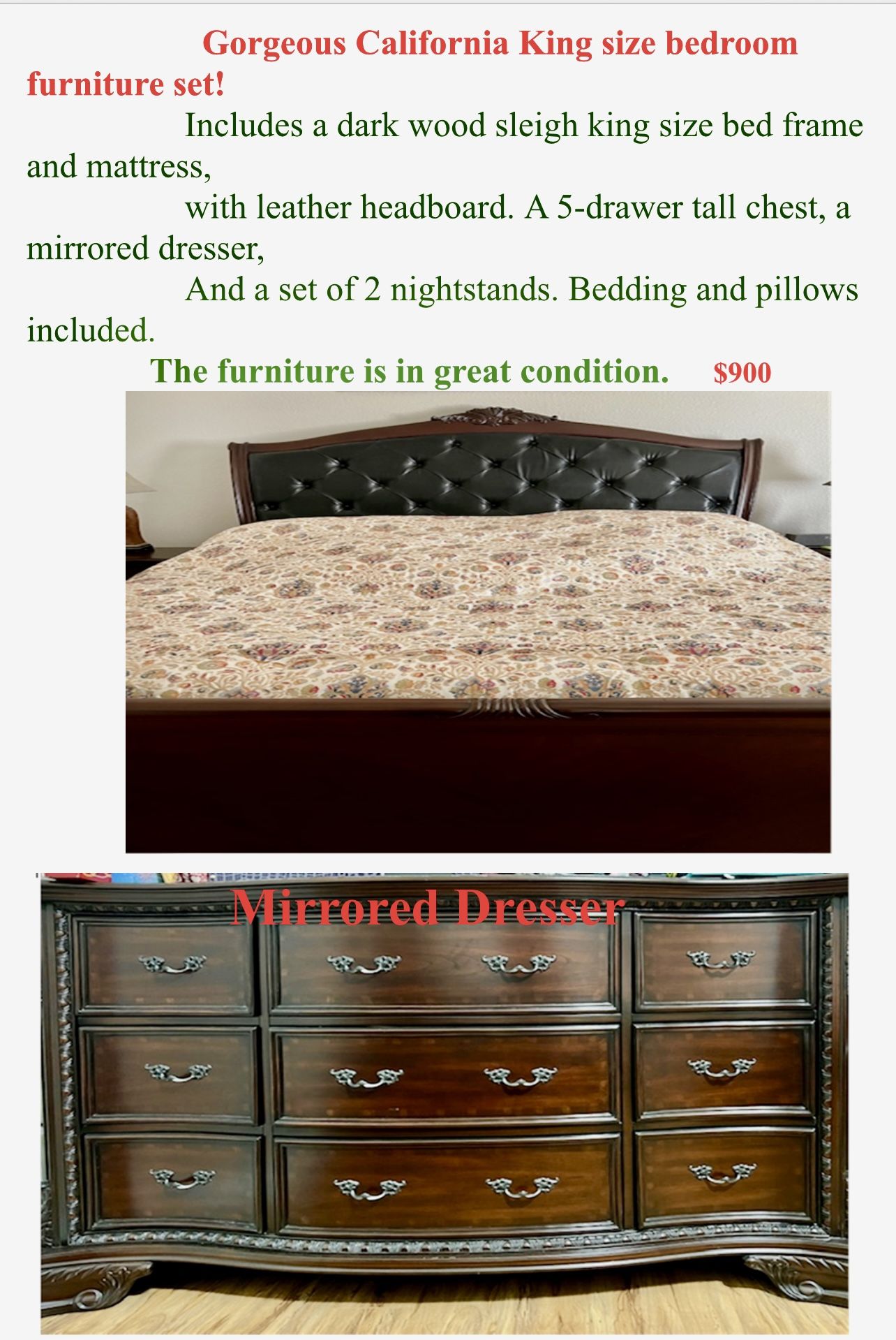 Gorgeous California king size bedroom furniture set! Includes a dark wood sleigh king size bed frame and mattress, with leather headboard. A 5-drawer tall chest, mirrored dresser, and a set of 2 nightstands. Bedding and pillows included. The furniture is in great condition.