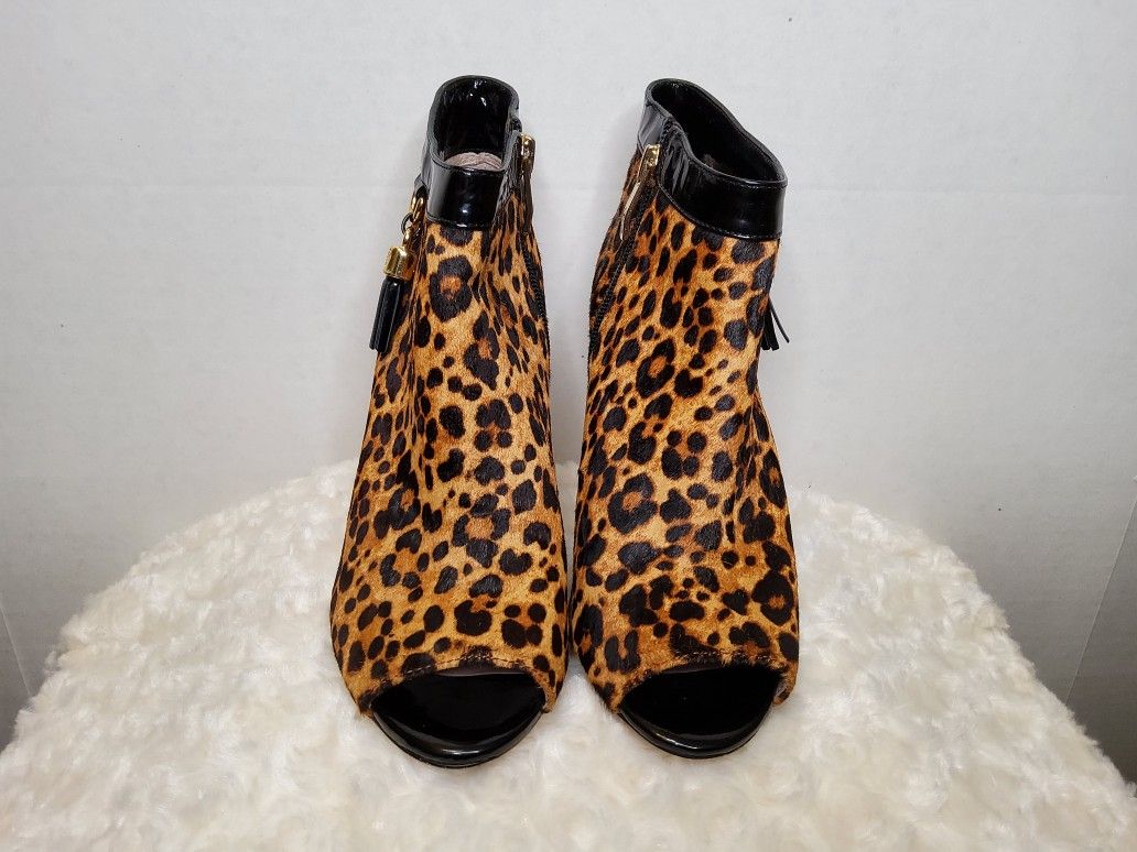 Used, but still in great condition! These are Vince Camuto Kevia Peep-toe booties leopard print calf hair with black patent leather trim and a stiletto heel. Size: 6M (see last pic) Has zipper close-up on one side and tassle on the other (see pics 3 & 4) CASH ONLY PLEASE