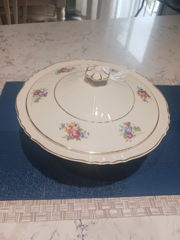 Syracuse China USA Serving Bowl With Lid In The Santa Rosa Pattern. It Is In The Federal Shape And Features An Ivory Base Decorated With Multicolored Floral Sprays. It Is Trimmed In Gold. The Bowl Has A Pedestal Bottom, The Rims Are Scalloped, Nice Detailing On The Lid . Measures 9" Tall From Top Of Lid. 9" Wide. 24 Ounces.