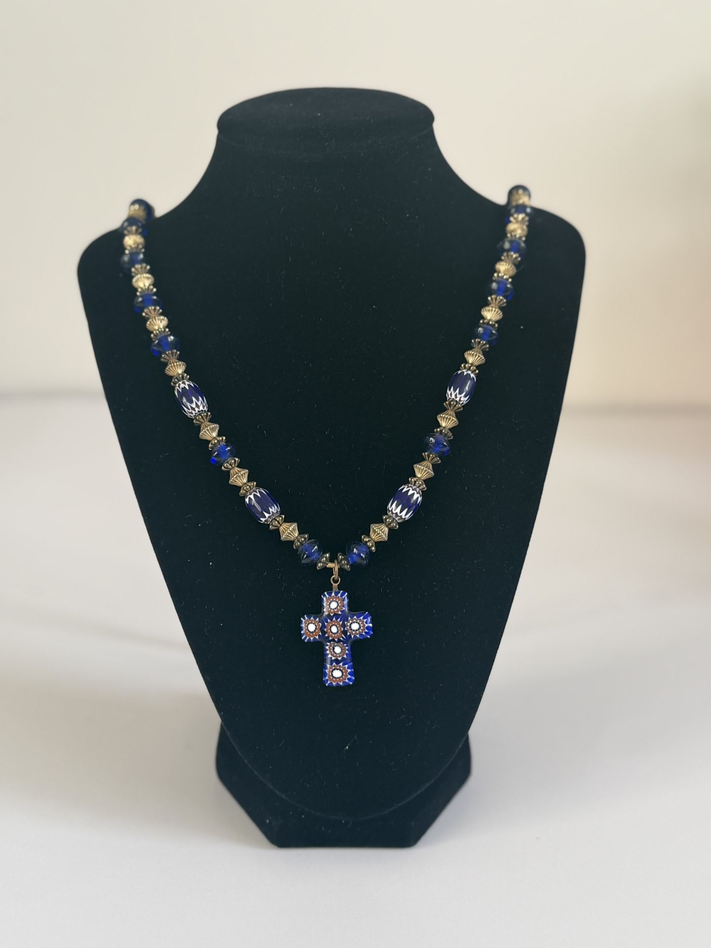 Vintage Blue Millefiori Glass Cross Necklace - Boho Ethnic Religious Pendant, Cobalt Beads