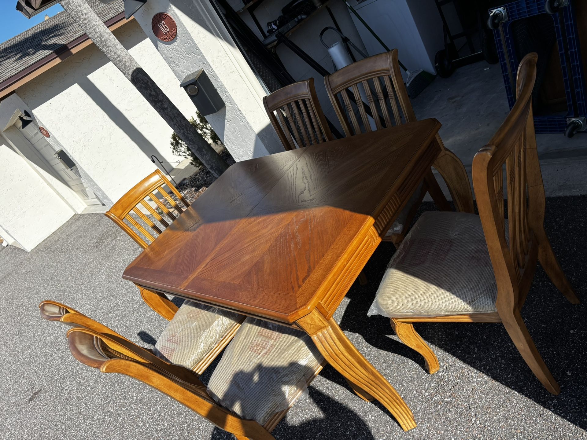 Excellent condition and solid. The protective plastic is still wrapped on the seat cushions from when it was purchased 20 years ago. There is a leaf but it’s not pictured inserted. Table seats 6. 64” L x 42” W x 30” H Add an additional 20” length with the leaf Serious inquiries only Cash only Pick up only