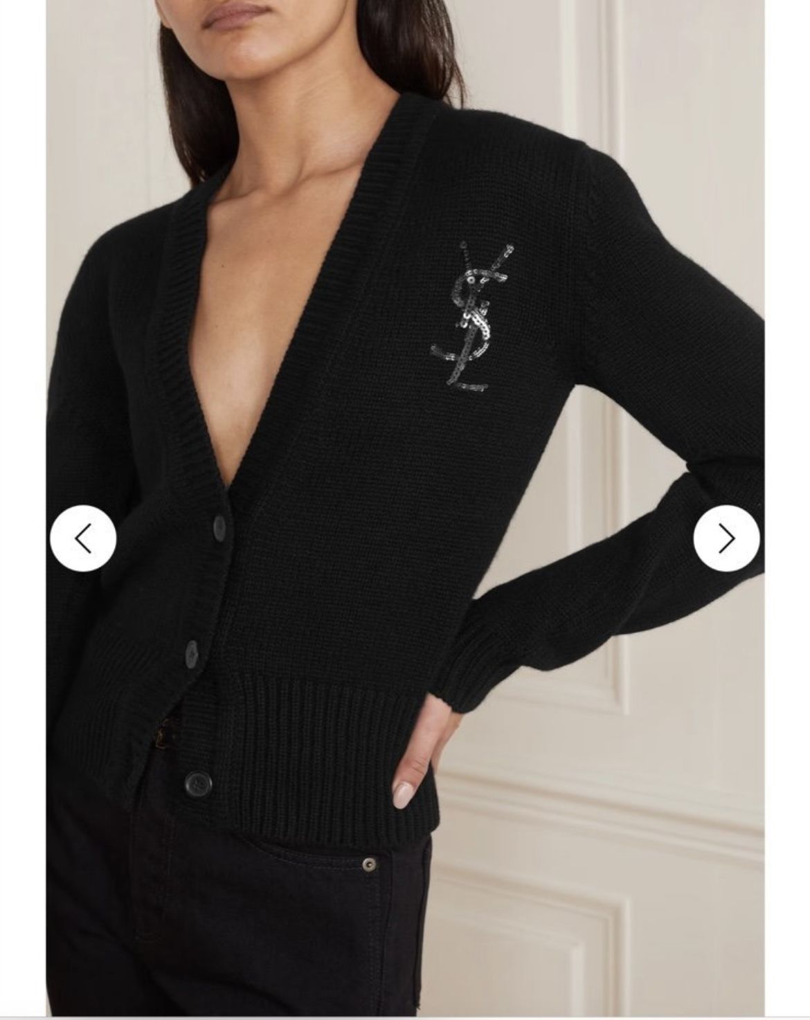 ※ I am selling items because I am moving abroad in June. If you are interested in anything, please purchase it as soon as possible. SAINT LAURENT Embellished cashmere cardigan New $1,790(original) Color: Black Size:XS It's the 'YSL' monogram that's hand-embellished using glossy sequins. Knitted from cashmere that's soft and plush, it slouches effortlessly through the slightly loose silhouette. SIZE & FIT Fits true to size, take your normal size Designed for a slightly loose fit Mid-weight knit Model is 180cm/ 5’11” and is wearing a size Small