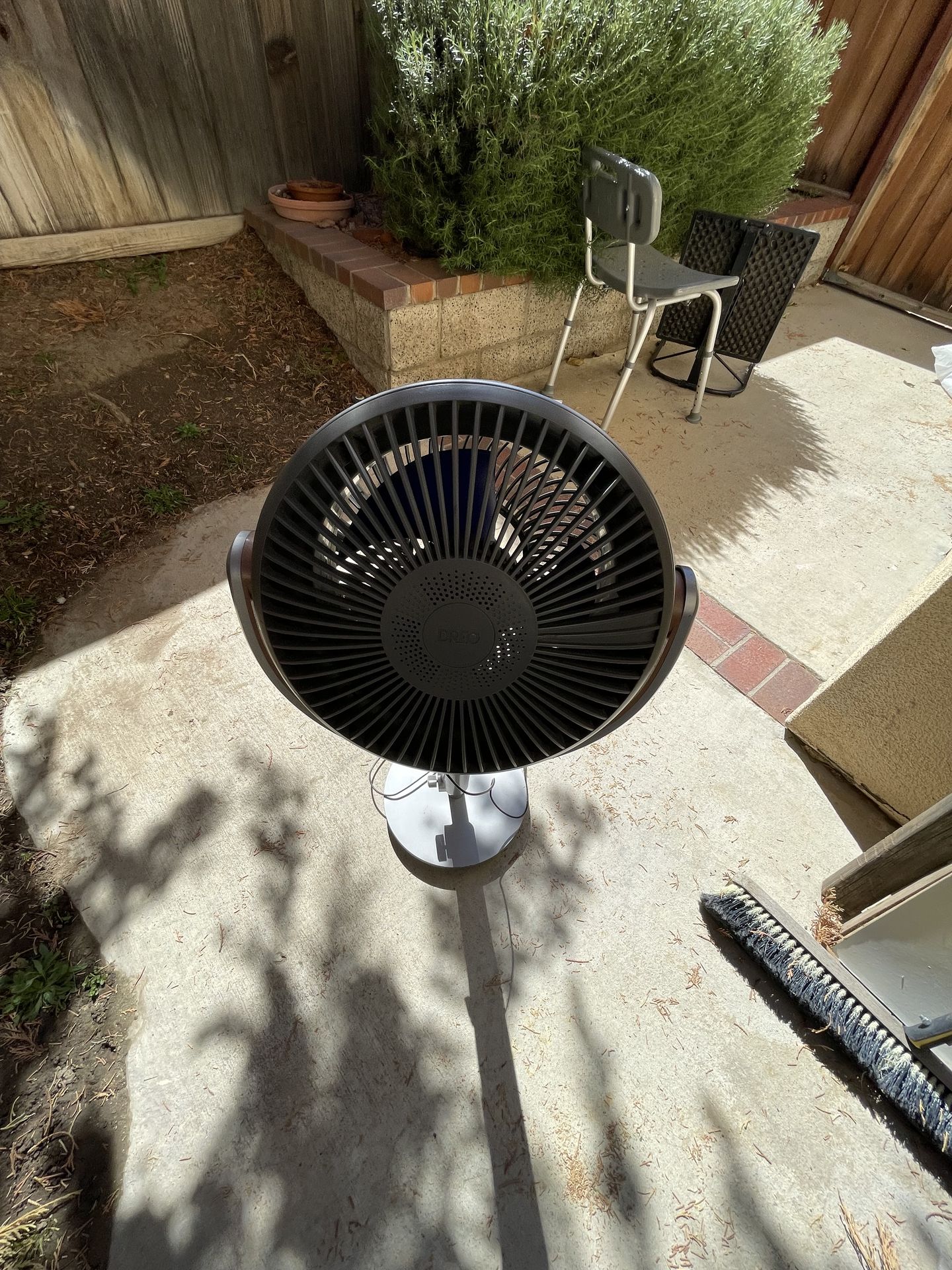 Dreo bladeless pedestal fan—sleek gray, 120° oscillation, quiet motor, remote control, adjustable height. Cord’s a tad tangled from outdoor use, but spins strong, no wobble. Perfect patio cooler—barely used!