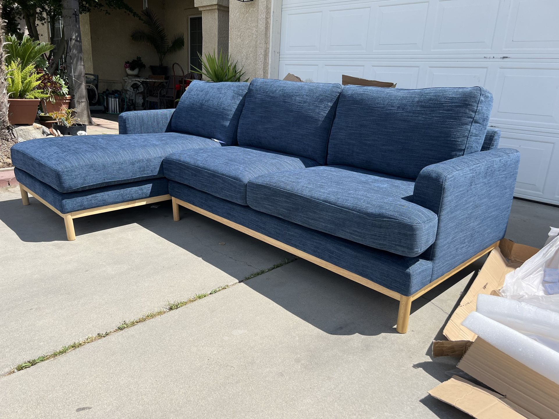 Brand New. 103” Mid Century Modern Sofa Sectional. Capri Blue/Natural Finish Frame. Left chaise side. Large comfortable deep seating. Retails Over $2200. Only temporary took out of manufactures plastic for photos and them rewrapped. Dimensions 103” wide. 35” deep (59” deep chaise side). 27” tall. High Quality piece. Manufactured by Jason Furniture(joss and main, article, poly and bark)
