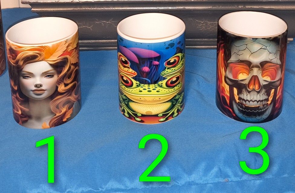 New/Never used 15 oz ceramic coffee mugs Ready to go Comes with gift box Clearing out stock. $4 each or bundle all 3 together for $10. Check out my other listings and make bigger money saving bundles. #1: 3D Red headed woman #2: 3D neon frogs #3: 3D skull in flames Pick up in Haines city 33844