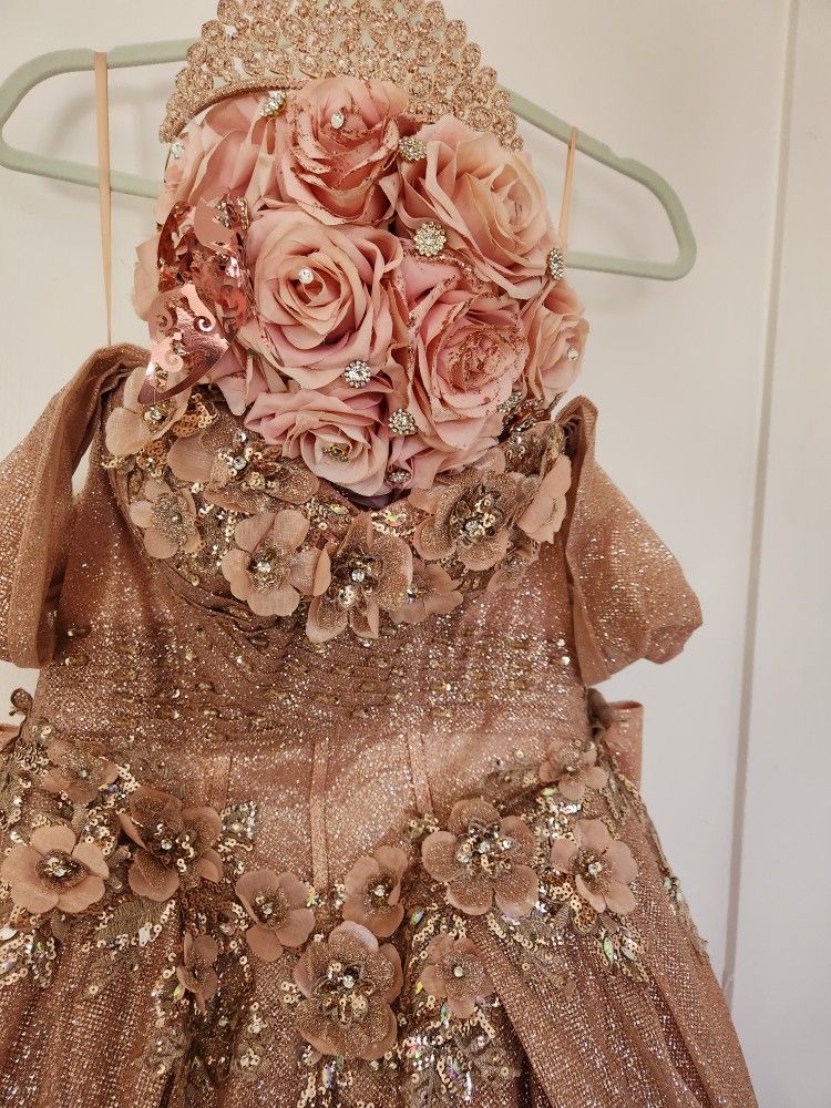 Lindo vestido Rose gold el glirel talla 2 se ajusta a un cuerpo S o M porq es de corset luce hermoso por la noche por el brillo increible q tiene fue limpiado despues de su uso ,se uso resientemente ,incluye ramo y corona a muy buen precio lo vendo por $ 450 fue comprado por $1400 esta muy hermoso