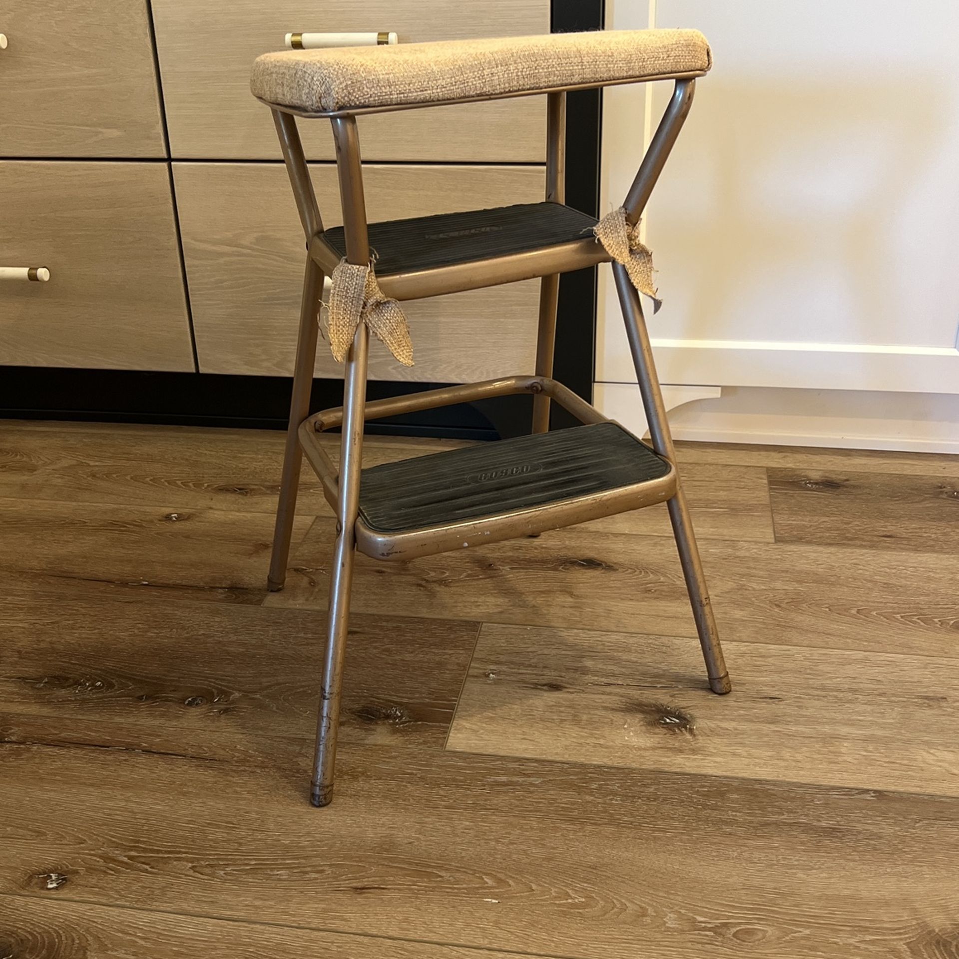 The seat cover was replaced with a different material. This is a great seat and step ladder. Vintage!!! Comes from smoke and pet free home