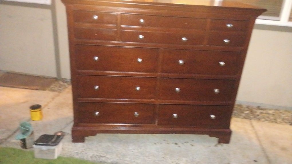 Solid wood cherry wood in colordresser is a beautiful piece of bedroom furniture in great shape very well taken care of. The dresser has 9 drawers it's roughly 48" tall and 60 wide. Very well made solid price of furniture. Price to sell but no reasonable offer won't be refused. Also will deliver for free with in 10 miles but any further there will be a fair fee.