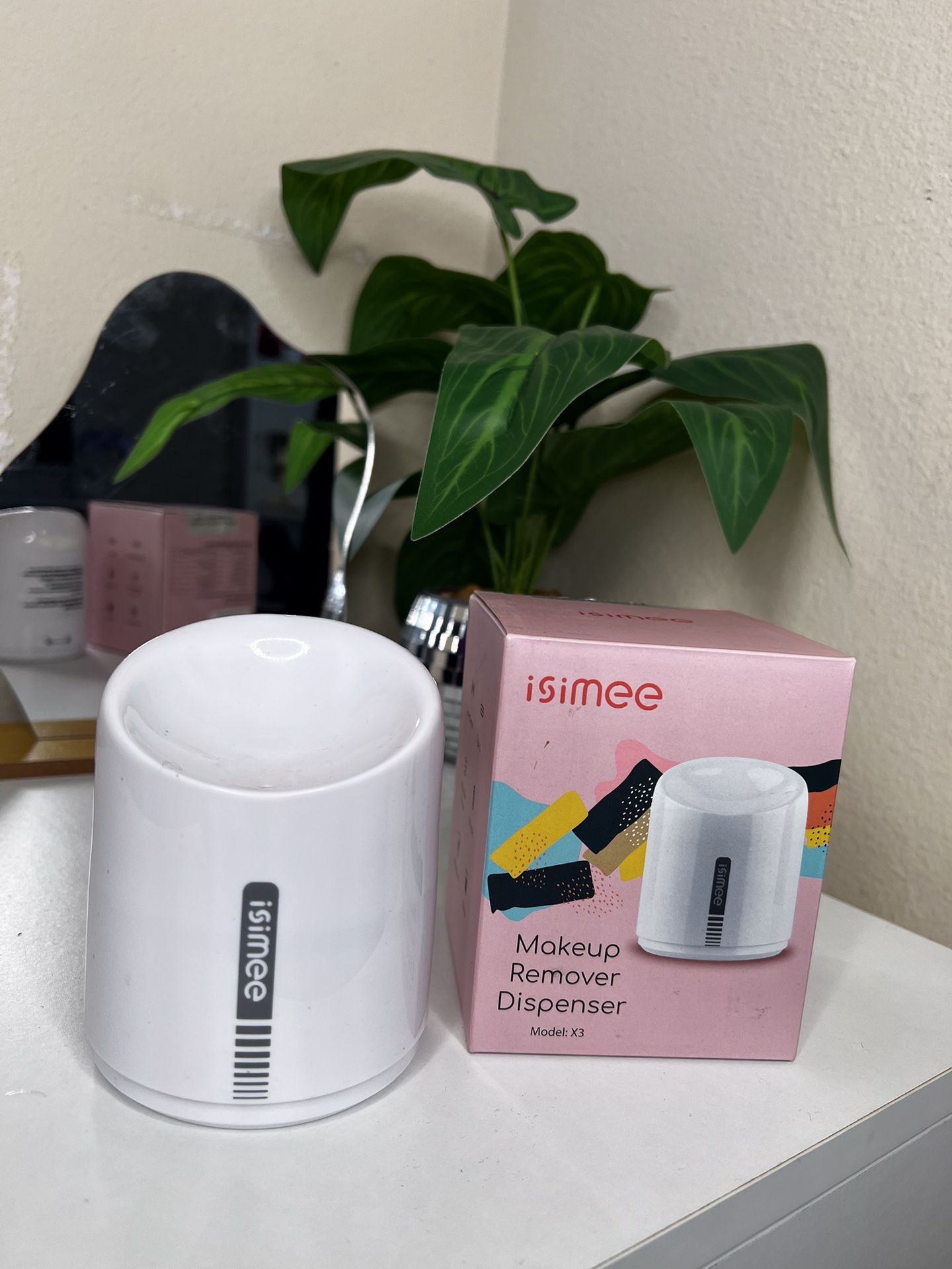 Automatic, make up remover dispenser, electric. Great for micellar water. Facial toner. Witch hazel C charger and instructions included. Swipe across top with cotton pad/ball and the perfect amount of liquid will be dispersed. Automatic sensor.