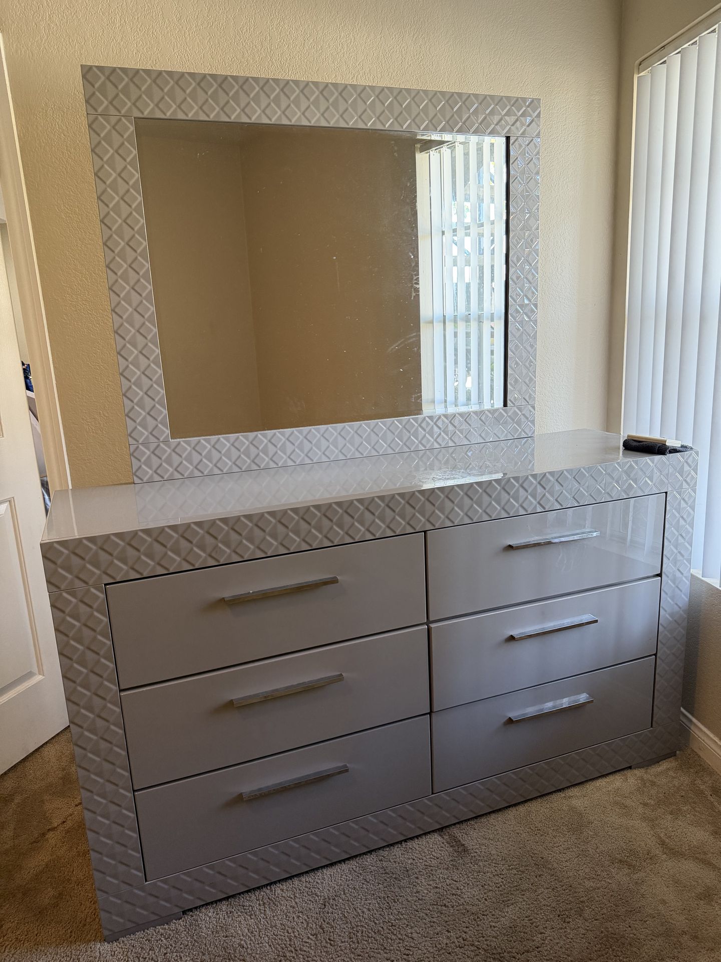 Beautiful high-gloss silver/gray dresser with matching framed mirror. Features a textured diamond pattern finish that gives it a luxury, modern glam look. Super sturdy and spacious with 6 deep drawers for plenty of storage. The mirror is large and makes the room feel brighter and bigger — perfect for getting ready or adding that statement piece to your space. • 6 smooth-gliding drawers • Sleek chrome handles • Glossy finish • Matching oversized mirror included • Great condition Perfect for a bedroom, guest room, or glam setup 💎 Serious inquiries only. Must pick up.
