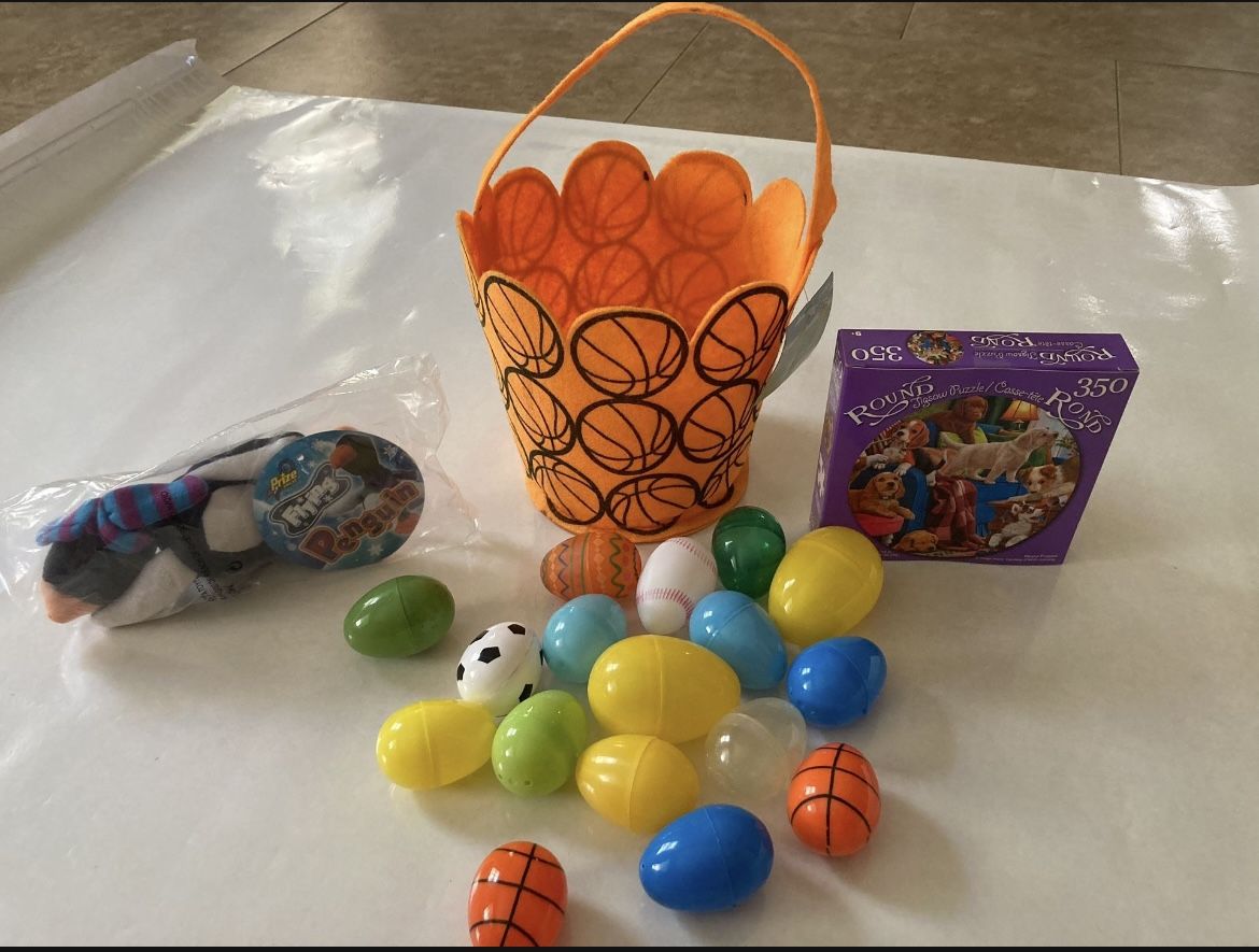Basketball Easter Basket 7"X 5" includes 17 Plastic Easter Eggs, Puzzle And A Stuff Animal Penguin.