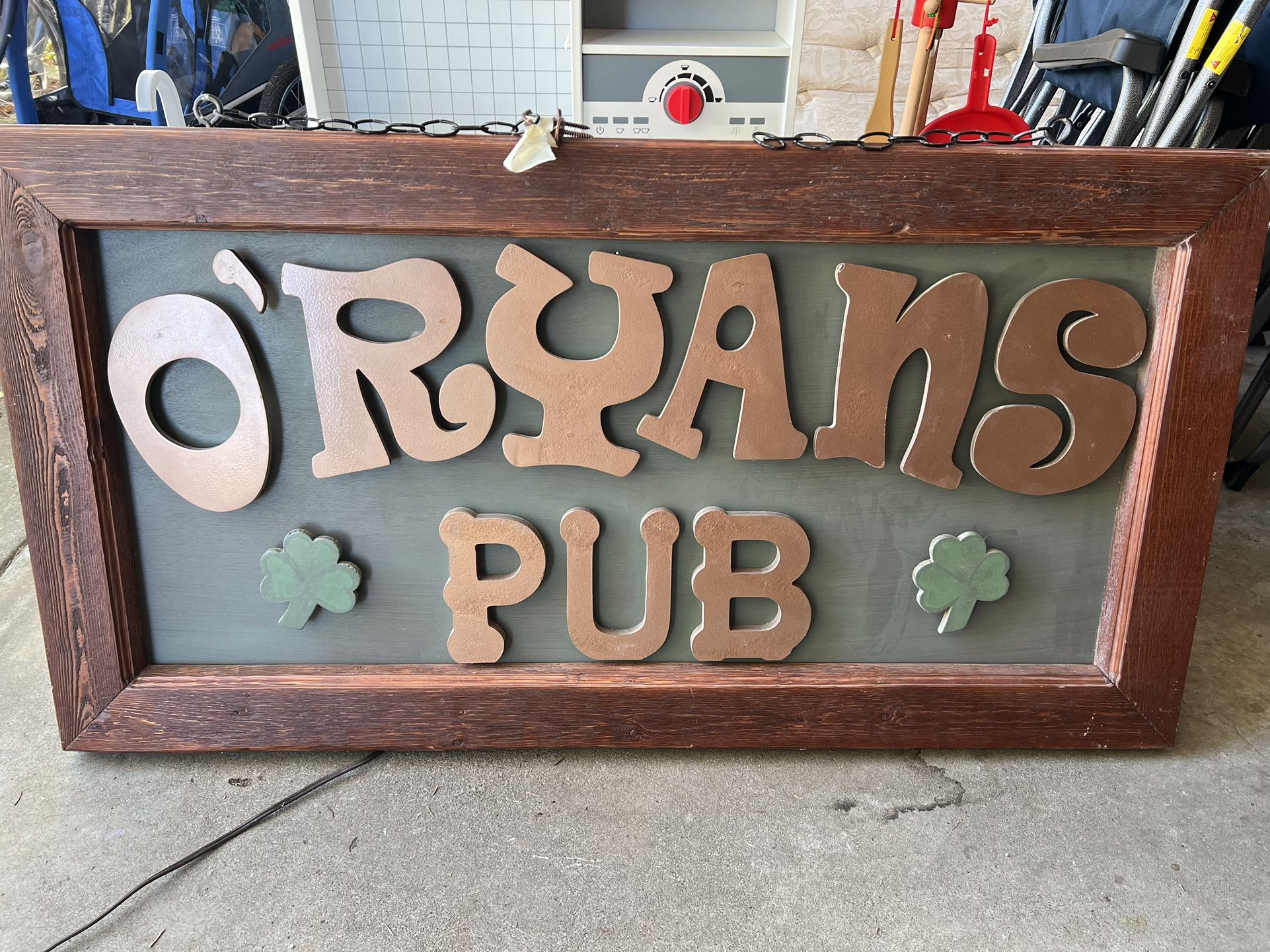 Custom made Irish style pub sign. Backlit letters, green and gold paint, rustic wooden frame. 5 ft cord plugs into standard home outlets. Heavy duty chain and screw wall mounts. 26” tall, 50” wide, 4” deep Buyer must pick up in NE Portland.