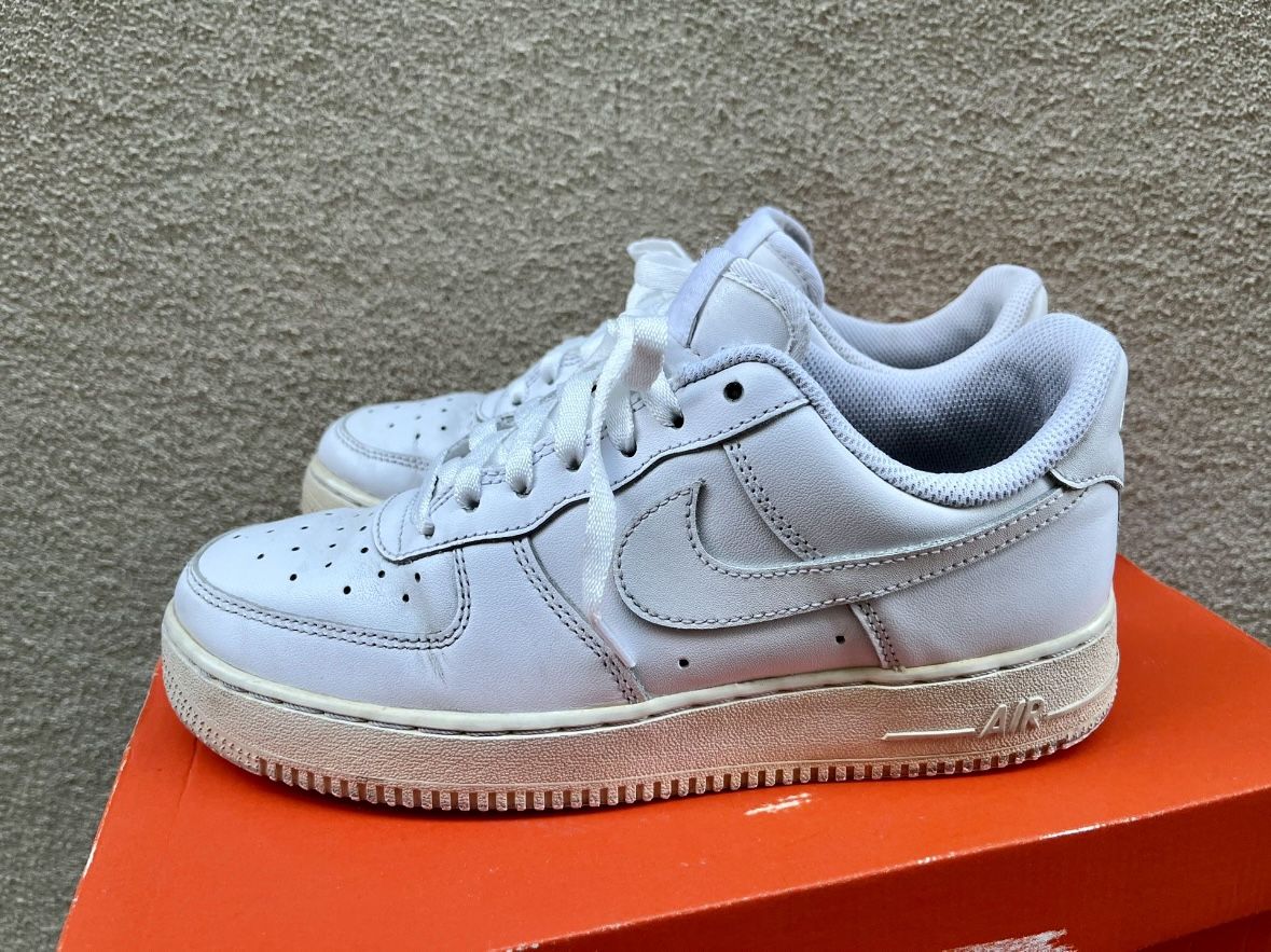 Nike White Low-Top Sneakers Retro Style Cushioning Description; Air Force 1 '07 LX trainers, a model that pays homage to the classic basketball models. Soft plain leather upper that does not wrinkle and is easy to clean. Side swooshes in the same colour. Perforated toe for better breathability. Leather tongue with embossed logo. Colour coordinated flat laces. Padded collar and reinforced heel tab with embroidered logo insert on the back. Fabric lining. Sewn-on rubber sole with raised Air lettering on the outside. Notched profile for added grip. Size 8 Women’s Size 6.5 Boy’s Used - New Laces. No Metal Air force Nike Lace Charms included. Retails $109 Selling $8 FIRM