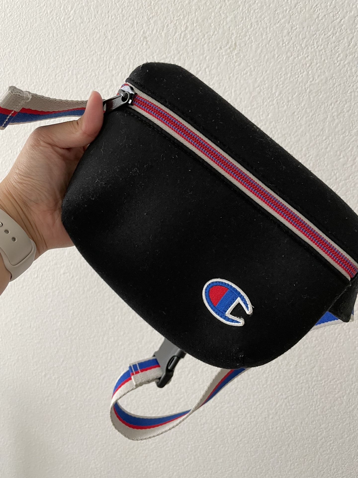 Black Champion Belt Bag It has a little bit of lint, but can use a lint remover to get rid of it. The band extends to wear it around your waist or chest. Cash only