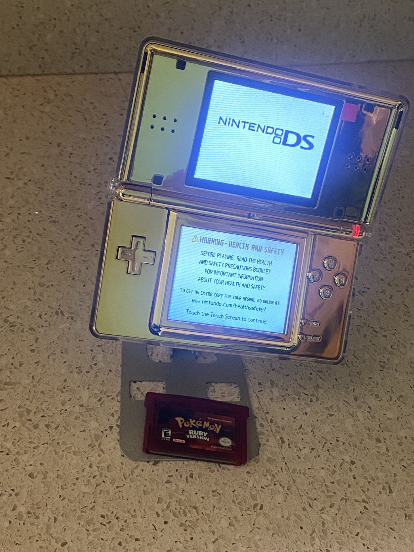 This is a very good quality Nintendo ds lite in a golden shell with a clear case over it. It has a new top screen with a film you can peel off basically brand new. All buttons work smoothly and it has a gold ds stylus. This is something a collector would want to keep. Comes with a flashcart if you want preloaded with a good amount of games if you want to know the games included message me and ask. Also includes charger and a new Ds case feel free to ask for pictures