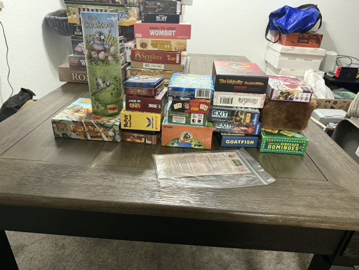 All games are complete. Most are lightly used. Open to offers! $5: -Giant Shiny Dinosaur Dominoes -Bears vs Babies -UNO No Mercy -Gang of Four -Brave Rats -Nerdy Inventions -Sushi Go! -Digimon Digi-Battle Card Game -Unexploded Cow -Eureka (has shelf wear) -Where in the World is Sandiego -EXIT The Enchanted Forest -EXIT Dead Man on the Orient Express -Goatfish -Honshu -The Majority Complete Edition -Raiders of the Lost Tomb (free with any purchase, a micro game) $10 -The Great City of Rome -Wings of War -Double 15 Dominoes -Tiny Epic Kingdoms -Here to Slay (sealed) -Hand-to-Hand Wombat -Running with the Bulls -The Settlers of Catan (has shelf wear) -Cogs in Machine -Monstrous -FS-MID -Sunken City -High Command -Via Appia -Dungeon Dwellers -Four Gardens -In the Year of the Dragon $20 -Alchemist -Simurgh -Risk 2210 A.D -Claustrophobia **SOLD** -Harry Potter Hogwarts Battle (includes expansion) -Sentinels of Multiverse (sealed) -Mystic Vale (sealed) $30 -Kanban Automotive Revolution -Dragon Lance (has shelf wear)