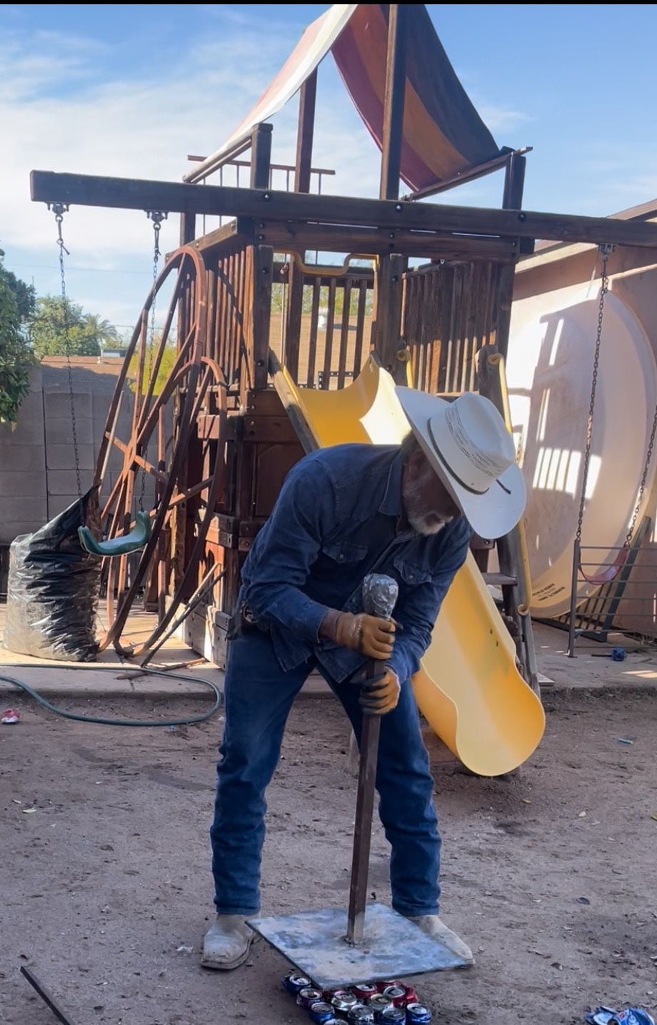Had this for our grandkids, but they outgrew it! Needs some sanding & restraining to be perfect!! My husband took it down, but have all the parts! It has a slide, 2 swings, climbing wall in the back, canopy, window flowerbeds, playhouse underneath, stairs, captains wheel.. etc