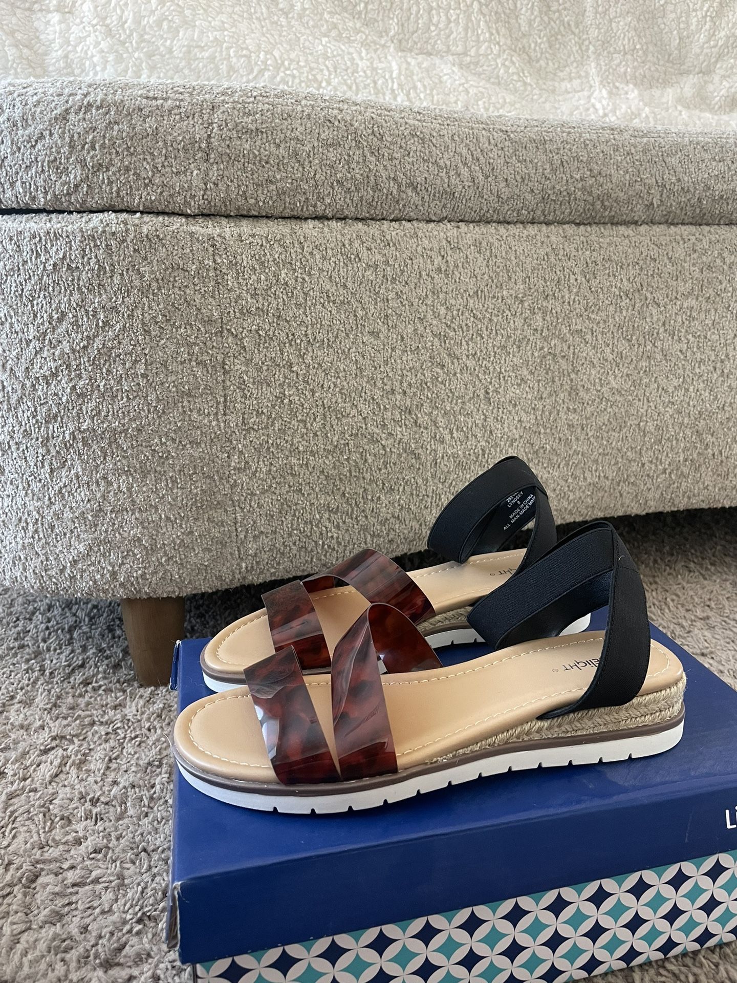 Brand new pair of women’s strappy sandals, size 8! They have a black ankle strap and a tortoise shell strap around the toe area. Never been worn, still in the box!