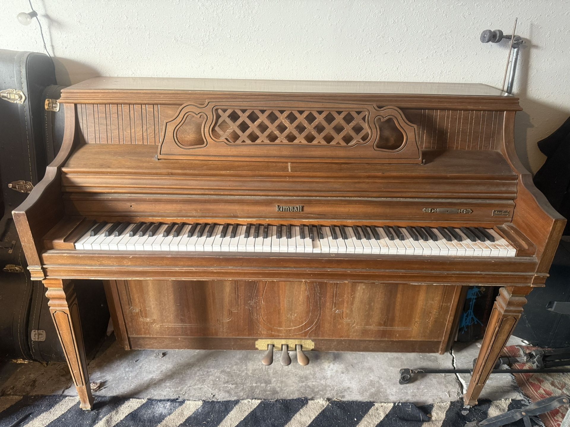 Vintage Kimball upright piano with beautiful wood cabinet and classic character. The piano will need a tuning and a little love. It has one dull key and has been stored in a garage. Priced accordingly. Great for someone who enjoys light restoration, a hobbyist, or for a creative studio piece. Details: • Brand: Kimball • Upright piano • All keys present • Pedals intact • Vintage wood cabinet Buyer responsible for moving. Pickup only. Located in [your area].