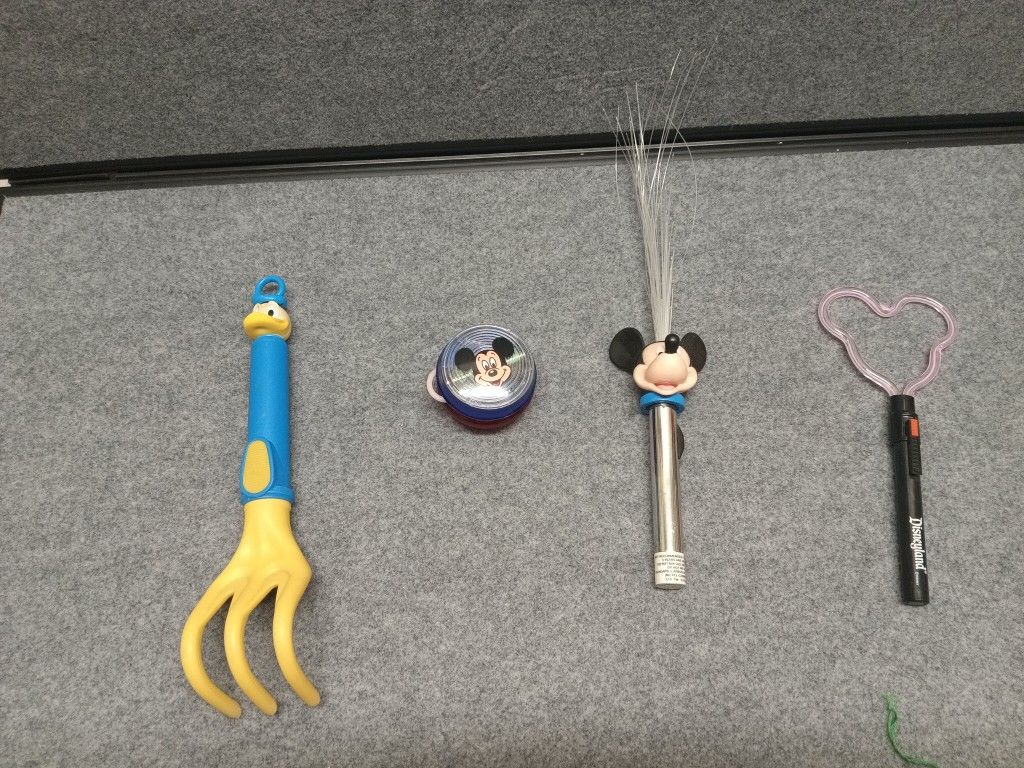 Different vintage disney items, all items shown are only 5.00 each Will update as they sell Donald hand rake Mickey yoyo Mickey light wand Mickey head light