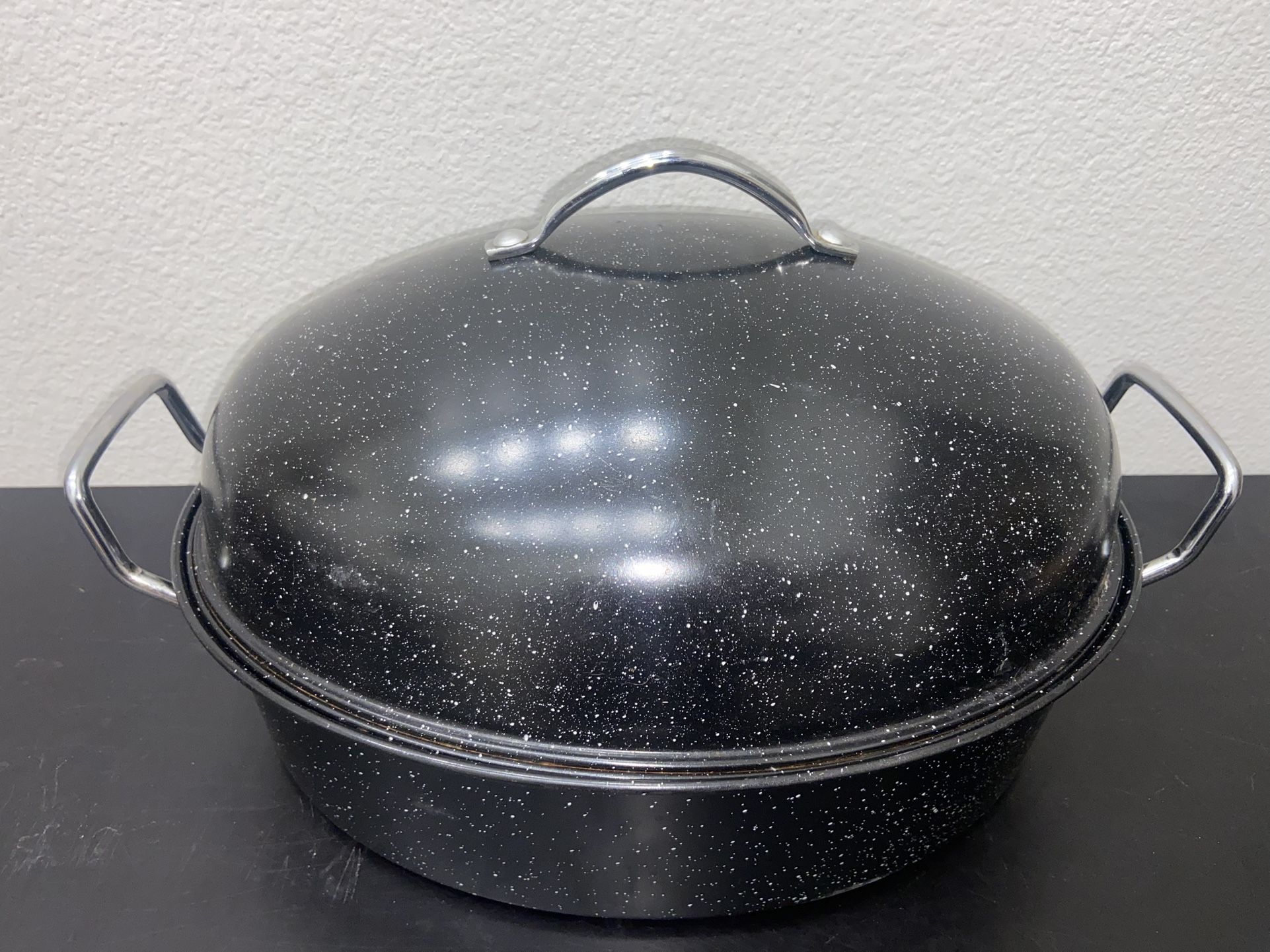 Enamelware oval roaster pan in speckled black finish including matching lid and removable roasting rack. Large capacity design ideal for roasting turkey, chicken, beef, vegetables, or meal prep. Durable enamel-coated steel construction with side handles and domed lid for even heat circulation. Preowned condition showing normal cosmetic wear and food residue from prior use, as shown in photos. Solid functional cookware set ready for continued kitchen use. About 15 inches wide.