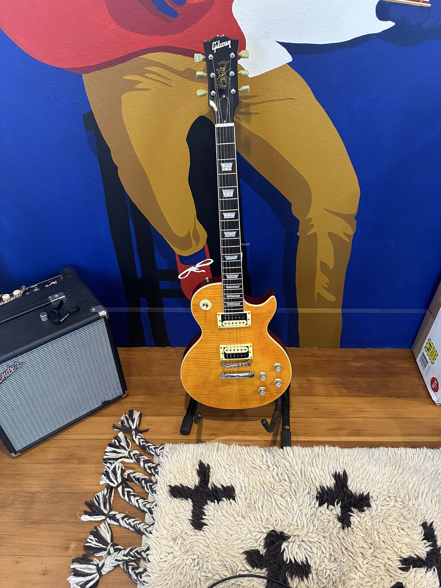 Part of Gibson’s Slash Collection, the Slash Les Paul Standard is a solidbody electric guitar that’s worthy of its namesake. Inject your playing with incredible warmth and sustain, thanks to a resonant solid mahogany body, that’s accented by an eye-catching AAA figured maple top. Enjoy unbelievable playability, courtesy of a comfortable rosewood-capped '50s vintage neck. And when you plug into your British stack, you’ll experience a mid-forward sustain and crunch that every Slash fan is sure to recognize, by virtue of dual Custom Burstbucker Alnico II pickups. The Slash Les Paul Standard sports hand-wired electronics, color-coordinated hardware, and a bevy of special Slash-approved touches