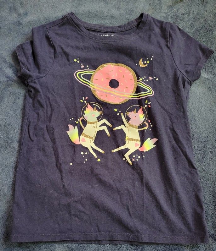 Sold as a lot. Rainbow unicorn t-shirt, unicorns in space t-shirt, stretchy denim Bermuda shorts. All girls size 7/8