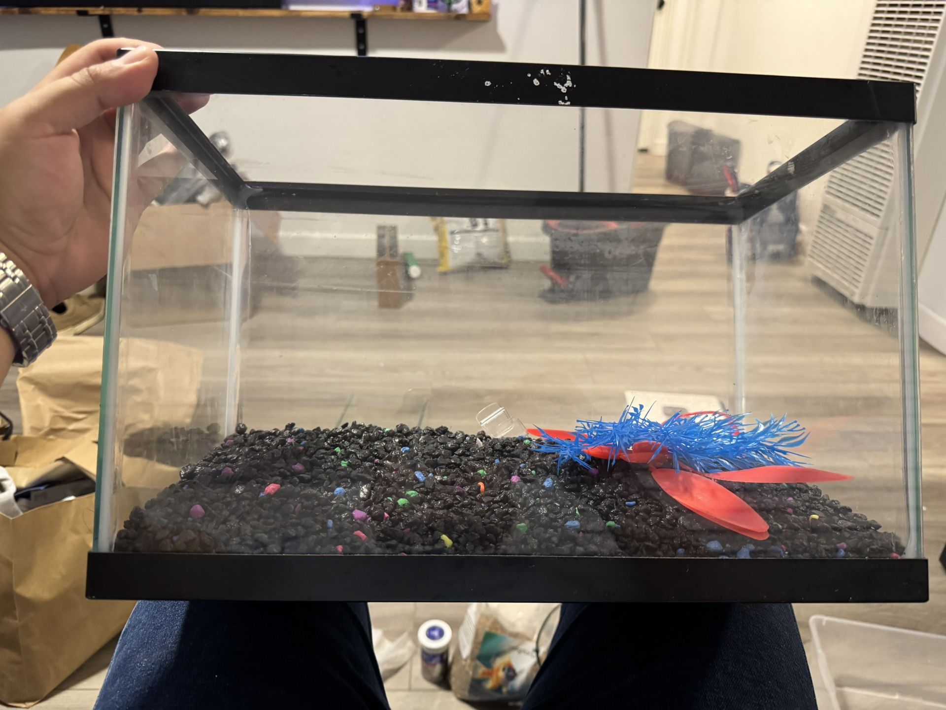 Full fish tank set up Large tank and small tank Air pump Decorations Food for betta Water heater Rocks in the tank plus spare bag of rocks