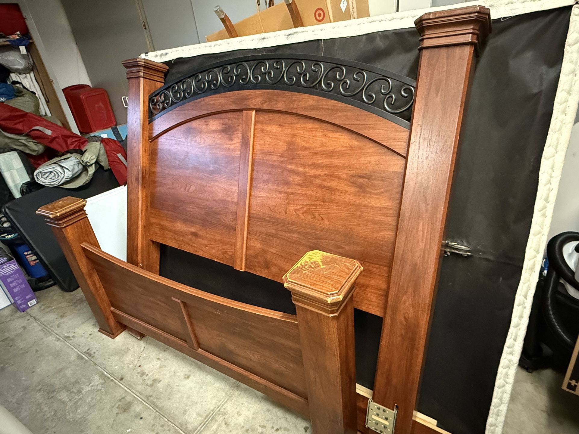 Queen size bed frame with wooden headboard and metal detailing. Good quality heavy wood, needs some stain on the footboard post. Includes the two side frame pieces that easily slide into the headboard, no hardware needed. No slats included. Must pick up. 2+ people and a truck is the best way to transport.