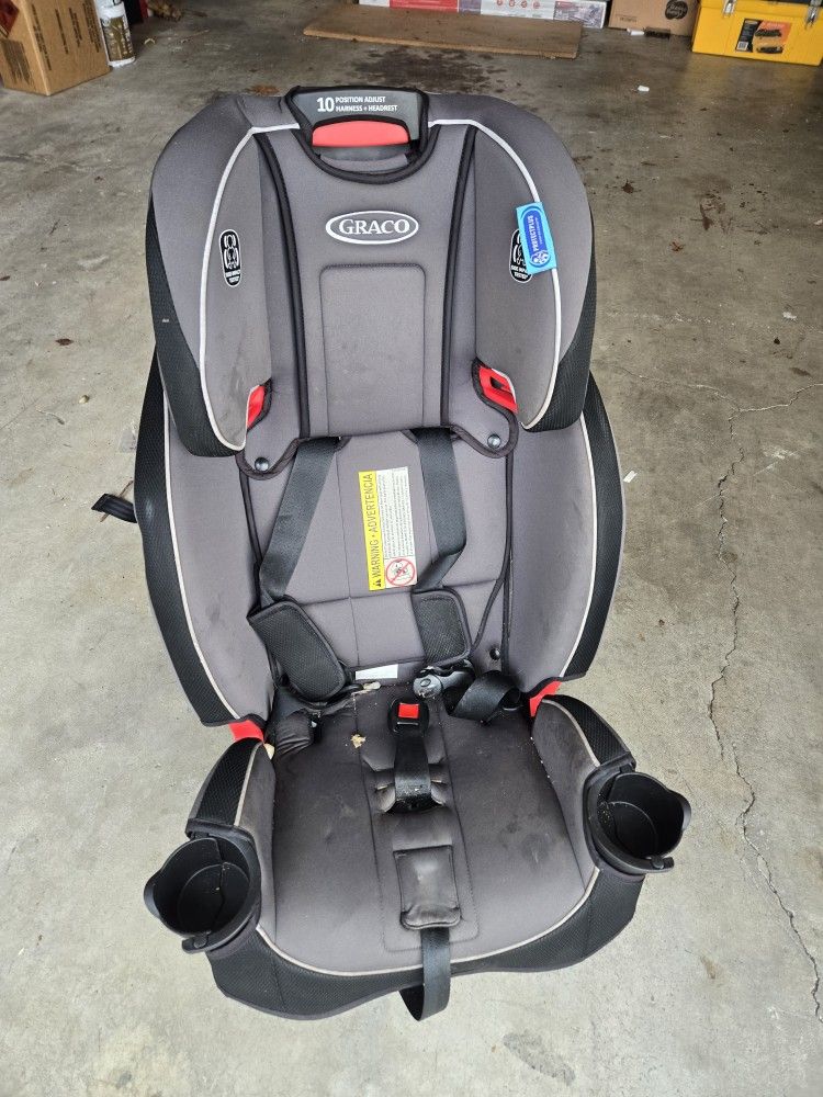 High back forward facing booster with harness that can convert to seat belt only. Has fasteners to fasten to seat. Doesn't expire until 2031